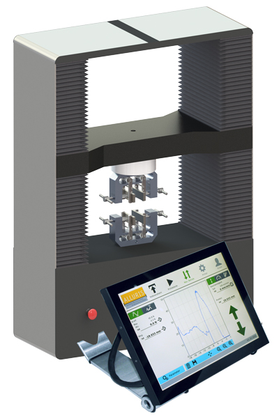 Die Größe des Prüfraums wird bestimmt durch die Bauart des Gerätes. Während der Prüfraum bei 1-Säulen Maschinen in der Regel nur nach hinten begrenzt ist und zur Seite und nach vorne offen bleibt, begrenzen die beiden seitlichen Säulen den Prüfraum eines geschlossenen Lastrahmens. Der Abstand zwischen den beiden Führungen bei 2-Säulen Universalprüfmaschine ist auch vom Kraftbereich abhängig.